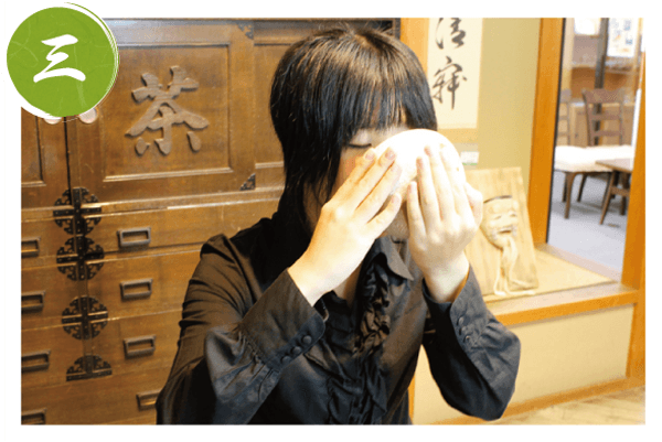 喝完後,輕輕擦拭飲用時觸碰過的位置。將茶碗逆時針轉2次,轉回正面後,欣賞茶碗。 |