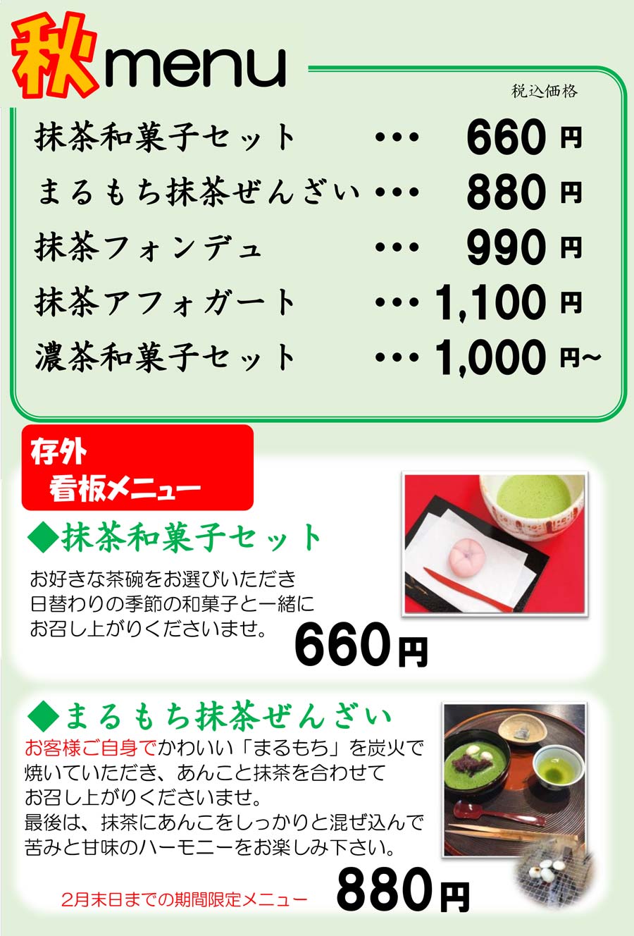 毎日違った四季折々の和菓子が登場。3軒の和菓子屋が丹精を込めた和菓子たち。それぞれに色の使い方はもちろん、作り手の感性が生きた一品です。おいしい抹茶とご一緒に、ご賞味下さい。